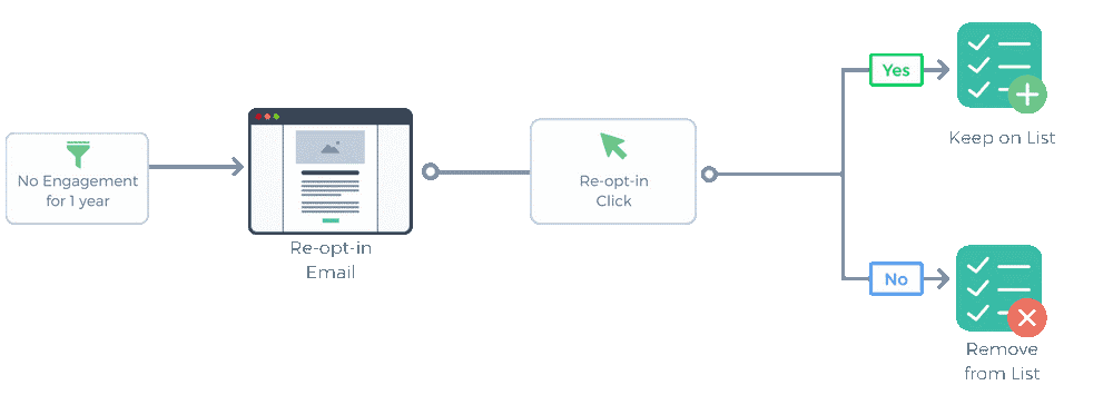 Thay vào đó, hãy thường xuyên dọn dẹp danh sách email của bạn để loại bỏ những người đăng ký không còn quan tâm đến doanh nghiệp. Một trong những cách tốt nhất để làm điều này là gửi một chiến dịch đăng ký lại hoặc kích hoạt lại.