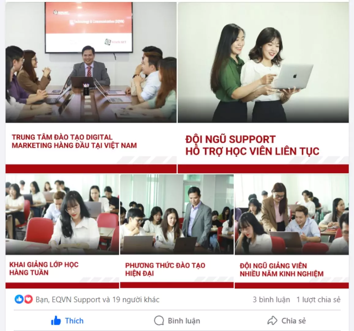 Ngoài ra, nếu muốn tìm hiểu nhiều hơn về các đặc trưng khi hoạt động trên Facebook, bạn cũng có thể tham khảo qua khóa học Facebook Marketing tại EQVN. Với bộ tài liệu được cập nhật mới nhất về toàn bộ các đặc điểm nổi bật khi kinh doanh cho bất kỳ người dùng nào, cũng như cách thức triển khai quảng cáo nhằm tăng độ nhận diện thương hiệu trên nền tảng Facebook