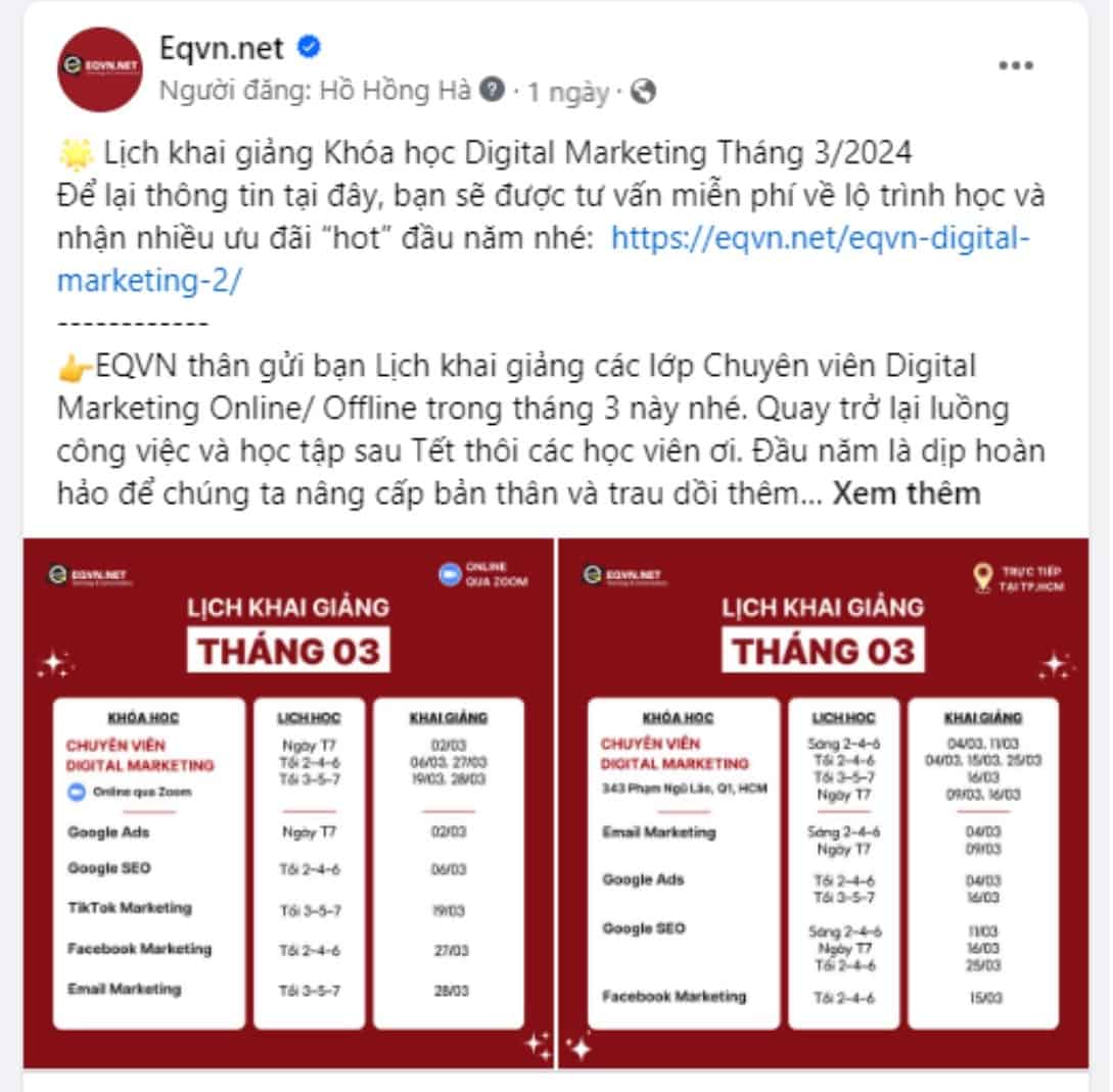Ngoài ra, nếu muốn tìm hiểu nhiều hơn về các đặc trưng khi hoạt động trên Facebook, bạn cũng có thể tham khảo qua khóa học Facebook Marketing tại EQVN. Với bộ tài liệu được cập nhật mới nhất về toàn bộ các đặc điểm nổi bật khi kinh doanh cho bất kỳ người dùng nào, cũng như cách thức triển khai quảng cáo nhằm tăng độ nhận diện thương hiệu trên nền tảng Facebook