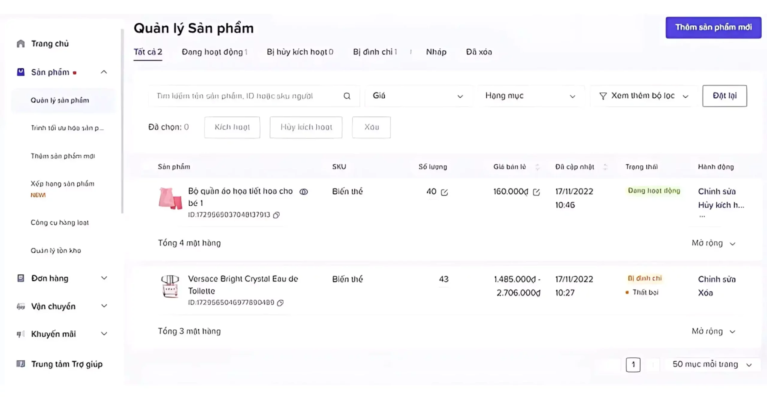 Trạng thái “Bị hủy kích hoạt”: Đây là những sản phẩm được người bán hủy kích hoạt khi hết hàng hoặc ngừng kinh doanh. Bạn vẫn có thể chỉnh sửa và kích hoạt lại sản phẩm khi cần thiết.