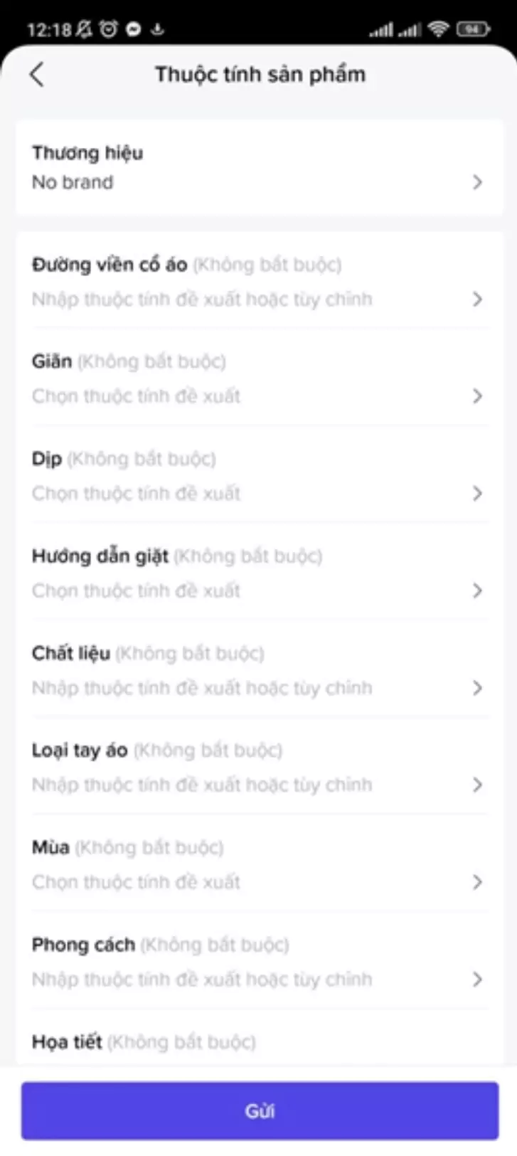 Lựa chọn thương hiệu nếu bạn bán sản phẩm thuộc thương hiệu của riêng bạn. Chọn “No brand” nếu không có thương hiệu. Bạn có thể điền thêm một số thông tin về thuộc tính như chất liệu, màu sắc… Đây là những trường thông tin không bắt buộc.