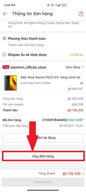 Sau khi tìm thấy đơn hàng muốn hủy, bạn nhấn vào đơn hàng để xem thông tin. Sau đó kéo xuống dưới cùng và nhấn chọn nút “Hủy đơn hàng”.