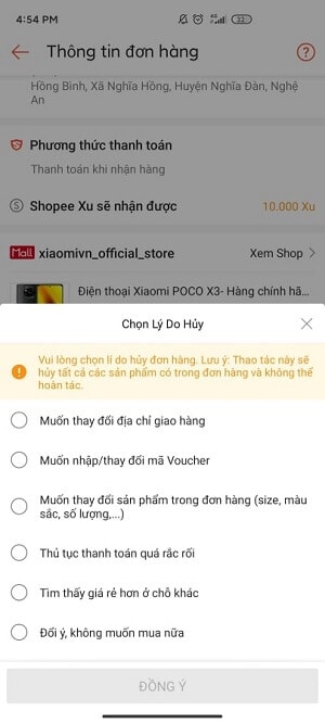 Sau khi nhấn nút, ứng dụng sẽ hiển thị bảng câu hỏi lý do bạn muốn hủy đơn hàng. Hãy lựa chọn lý do phù hợp nhất với bạn mong muốn.