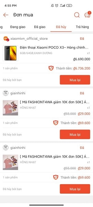 Sau khi lựa chọn xong lý do hủy đơn hàng phù hợp thì bạn nhấn “Đồng ý”, vậy là đơn hàng của bạn sẽ được hủy ngay lập tức. Để kiểm tra lại trạng thái Hủy đơn hàng, bạn quay lại mục Đơn mua, rồi chọn mục Đã hủy nhằm mục đích xem lại các đơn bạn đã hủy.