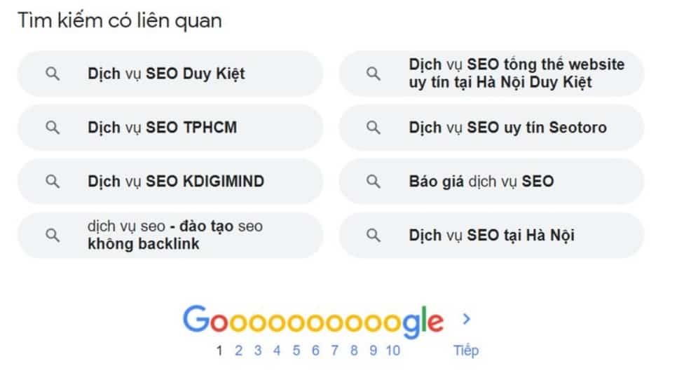 Chúng ta hãy lấy cùng một truy vấn tìm kiếm, “dịch vụ SEO”, và kéo xuống dưới cùng của trang kết quả tìm kiếm cho đến khi bạn thấy các kết quả tìm kiếm liên quan