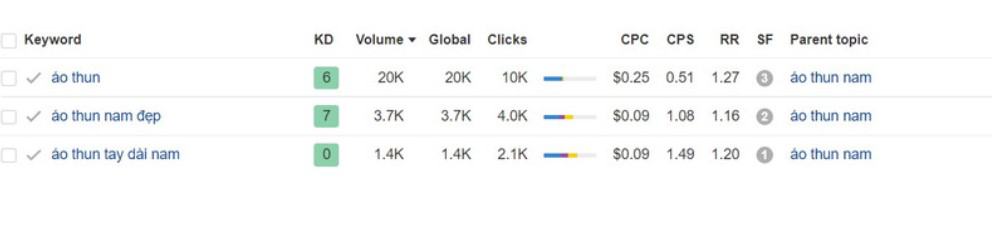 Ví dụ, EQVN đã chạy một từ khoá đuôi ngắn, một từ khoá đuôi trung bình và một từ khóa đuôi dài: “ áo thun”, “áo thun nam đẹp”, “áo thun tay dài nam” thông qua công cụ Ahrefs và có số liệu thống kê từ khóa. Như bạn có thể thấy hình ảnh bên dưới, lưu lượng truy cập giảm đáng kể từ khi từ khóa dài hơn.