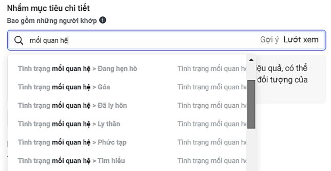 Bạn có thể target đối tượng Facebook dựa theo tình trạng quan hệ mà họ khai báo trên Facebook cá nhân. Hình bên dưới cũng cho thấy rằng, bạn hoàn toàn có thể target vào những người Đã kết hôn, Đang hẹn hò, thậm chí là Ly hôn. Chẳng hạn, nếu bạn chạy quảng cáo cho dịch vụ chụp ảnh cưới, bạn có thể target đối tượng Facebook đến những người đã đính hôn hay đang hẹn hò.