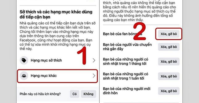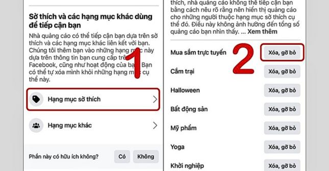 Bước 2: Bạn chuyển đến phần Hạng mục sở thích, tiến hành Xóa, gỡ bỏ những chủ đề về sở thích mà bạn không muốn xuất hiện trong quảng cáo trên Facebook.