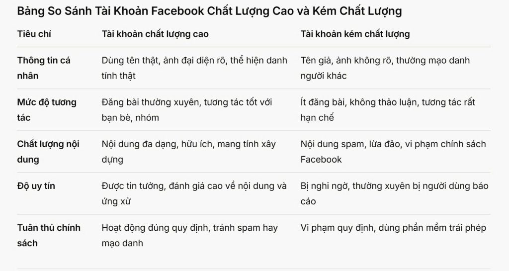 Tài khoản chất lượng cao có thông tin thật, tương tác tốt và nội dung giá trị, còn tài khoản kém chất lượng thường giả mạo, ít hoạt động. Các tiêu chí đánh giá bao gồm: thông tin xác thực, mức độ tương tác cao, nội dung hữu ích, và tuân thủ quy định Facebook. Phân biệt này rất quan trọng để bạn biết cách nâng cấp tài khoản của mình.