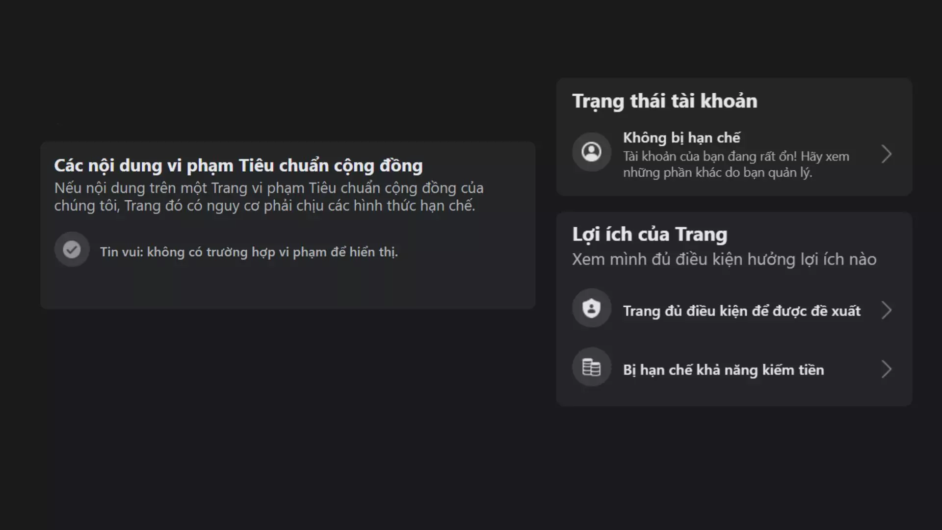 - Bước 3: Tình trạng của Fanpage sẽ được hiển thị trên màn hình. Nếu hiện tích xanh, Fanpage đang ở trạng thái tốt và có thể tiến hành chạy quảng cáo.\