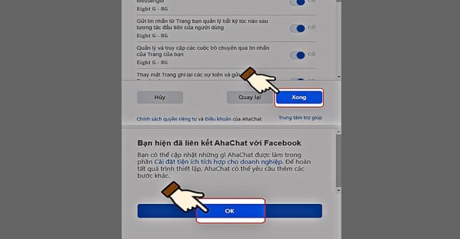 Bước 4: Click chọn trang bạn muốn tạo chatbot và nhấn nút “Tiếp”. Sau đó hệ thống sẽ yêu cầu bạn cấp quyền cho Ahachat truy cập vào Messenger Facebook, hãy chọn mục “Xong” và tiếp đến là chọn nút “OK”.