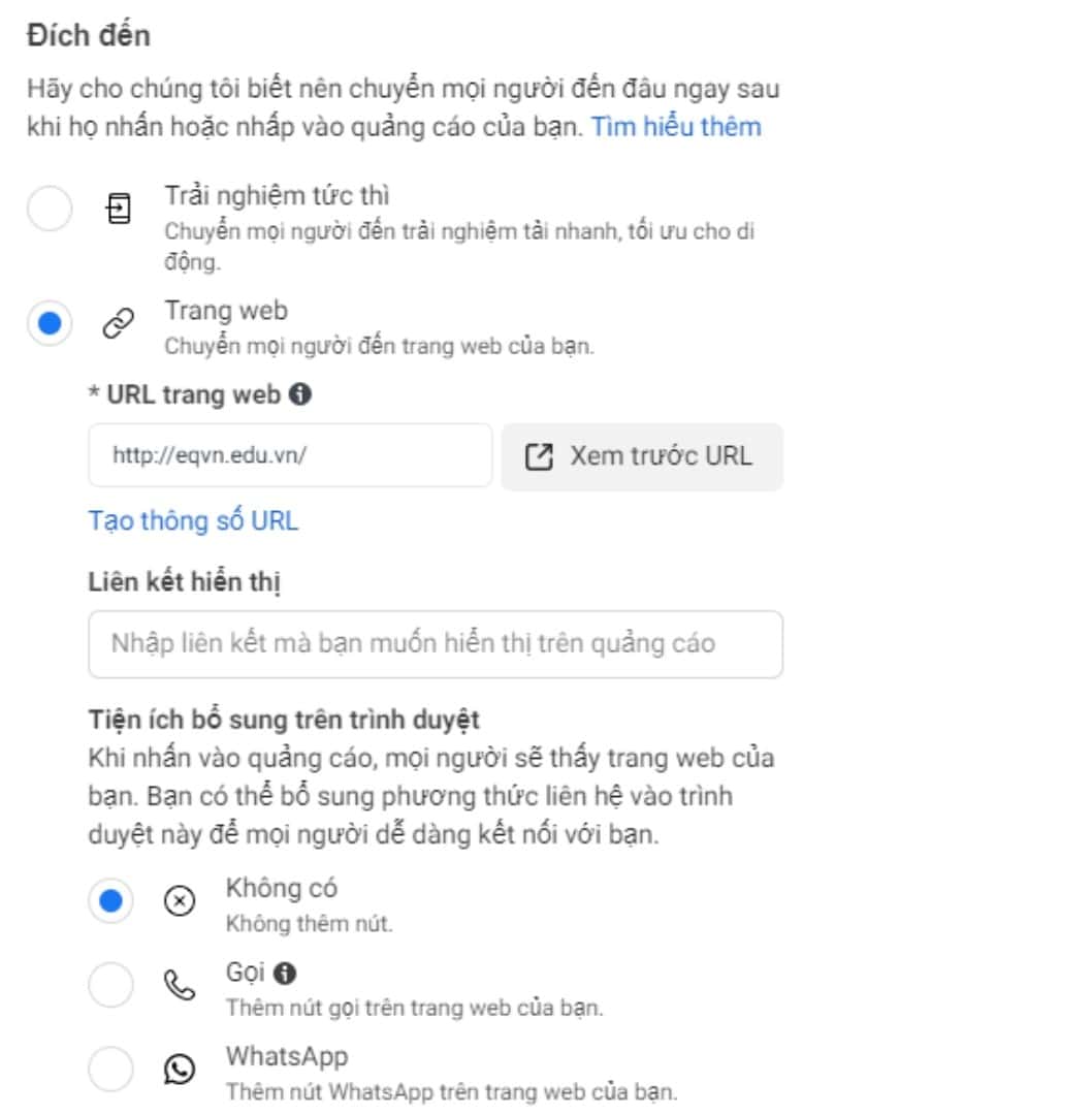 Bạn cần chọn vị trí chuyển đổi của quảng cáo nơi bạn muốn tăng lưu lượng truy cập. Bạn sẽ bổ sung chi tiết về trang đích sau này như hình.