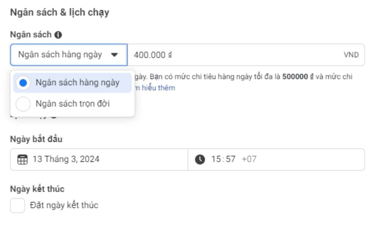 Chọn ngân sách và ngày bắt đầu kết thúc cho chiến dịch. Ngân sách quảng cáo sẽ có 2 loại mà bạn cần lưu ý sau đây: