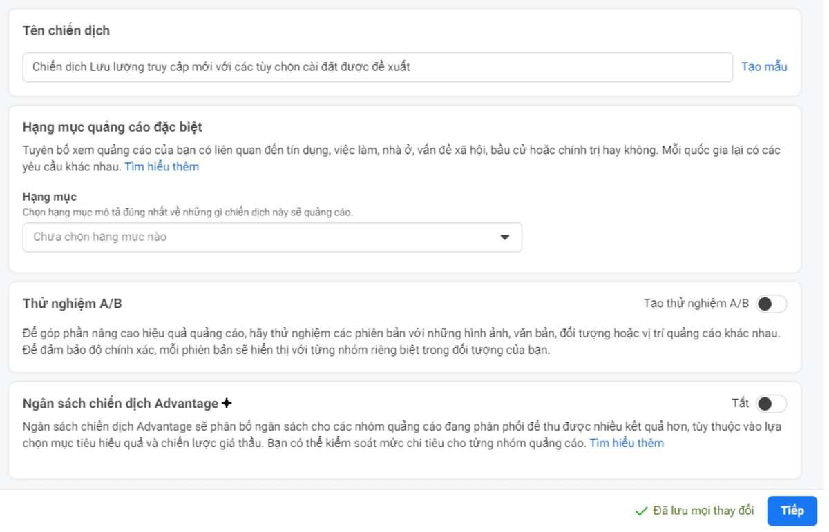 Ở phần này bạn cần đặt tên cho chiến dịch, chọn hạng mục quảng cáo, thử nghiệm A/B, ngân sách chiến dịch Advantage. Bấm Tiếp