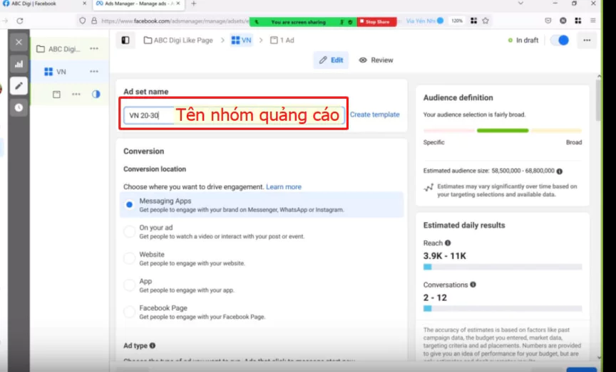 Bạn nên đặt một cái tên đơn giản, dễ nhớ, gợi nhắc về chiến dịch quảng cáo cho fanpage của mình. Sau đó nhấp vào “Tiếp tục” và đến bước cài đặt chi tiết cho nhóm quảng cáo.
