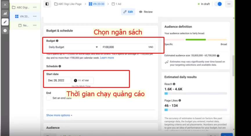 Ngân sách hàng ngày: Tức là trong vòng 24 giờ kể từ khi bạn đặt quảng cáo, Facebook sẽ tiêu hết số tiền bạn đưa. Bạn có thể thử chạy quảng cáo với ngân sách từ 50.000đ – 100.000đ/ngày trong 5 đến 10 ngày đầu. Sau đó, bạn chỉ cần điều chỉnh ngân sách hợp lý để đạt được hiệu quả chạy quảng cáo Like Page.