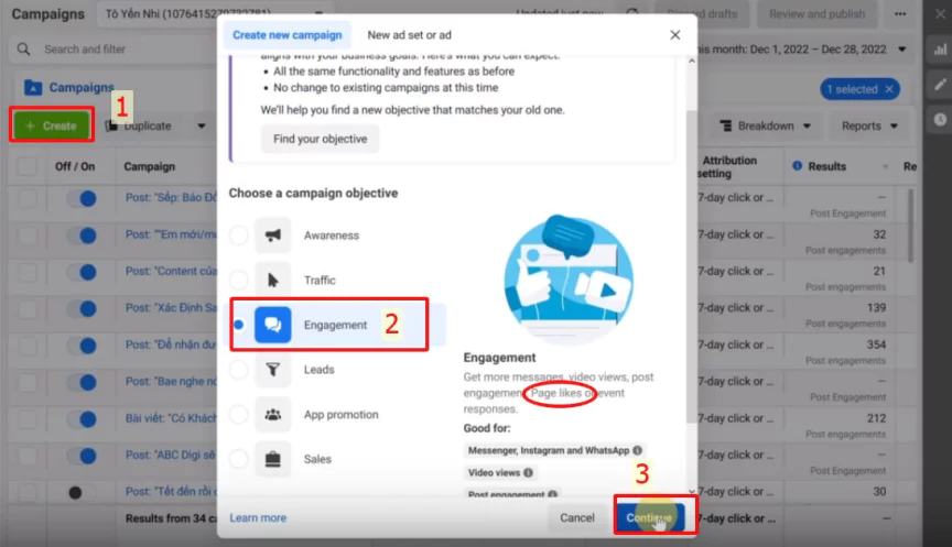 Trên tab Hoạt động, nhấp vào nút Tạo (Create). Sau đó chọn kiểu tương tác là Engagement và nhấn tiếp tục (Continue) như hình bên dưới.