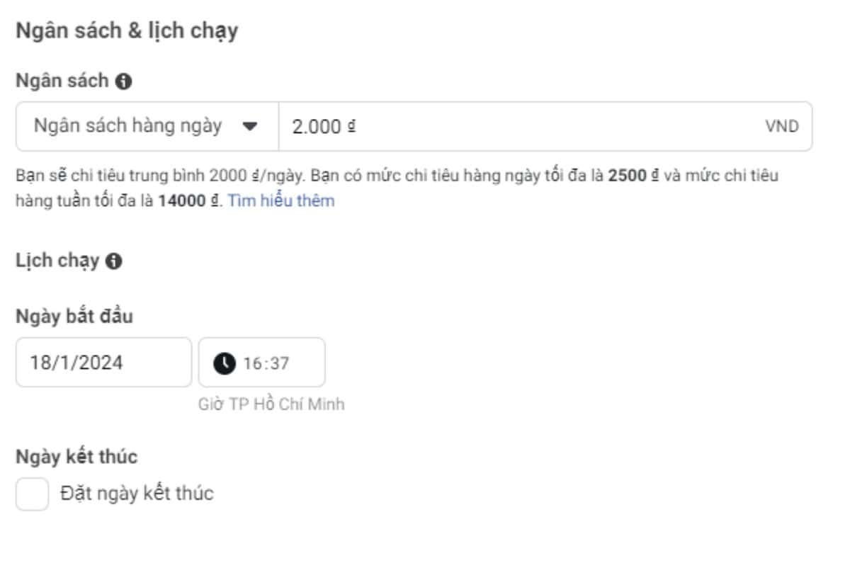 - Đặt lịch chạy quảng cáo: Thiết lập thời gian bắt đầu và kết thúc cho chiến dịch quảng cáo.