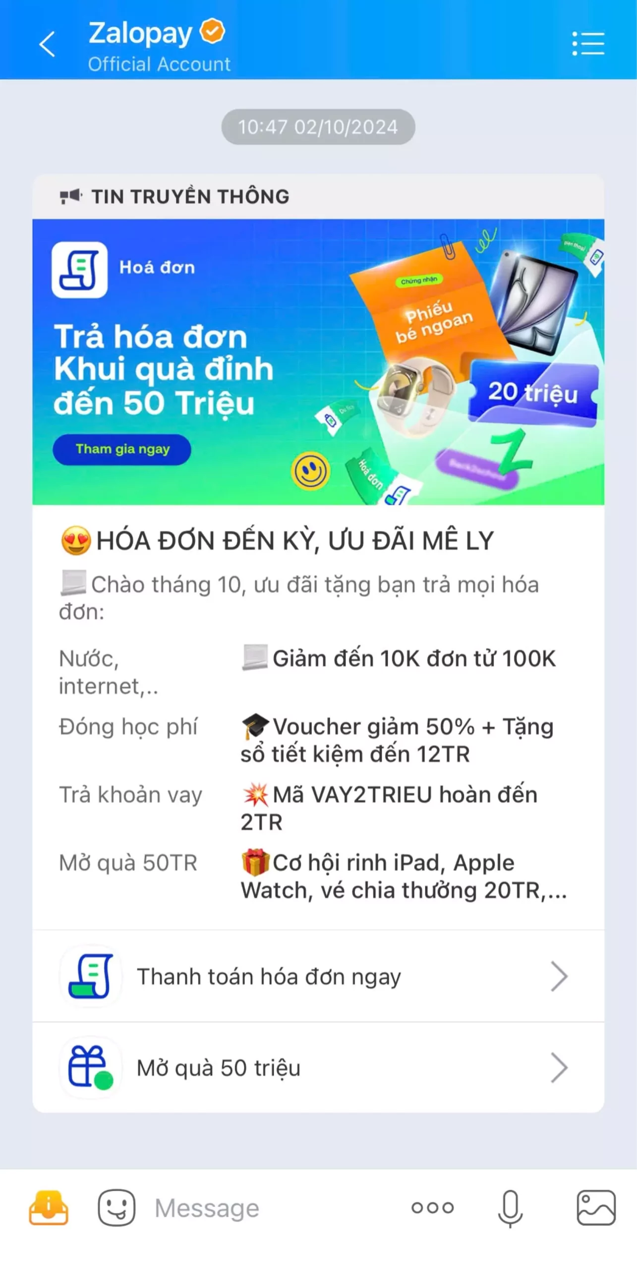 - Quảng cáo tin nhắn (Zalo Message Ads): Gửi tin nhắn trực tiếp đến khách hàng tiềm năng ngay trên ứng dụng Zalo với nội dung tùy chỉnh, giúp tạo cảm giác cá nhân hóa và tăng tỷ lệ tương tác.
