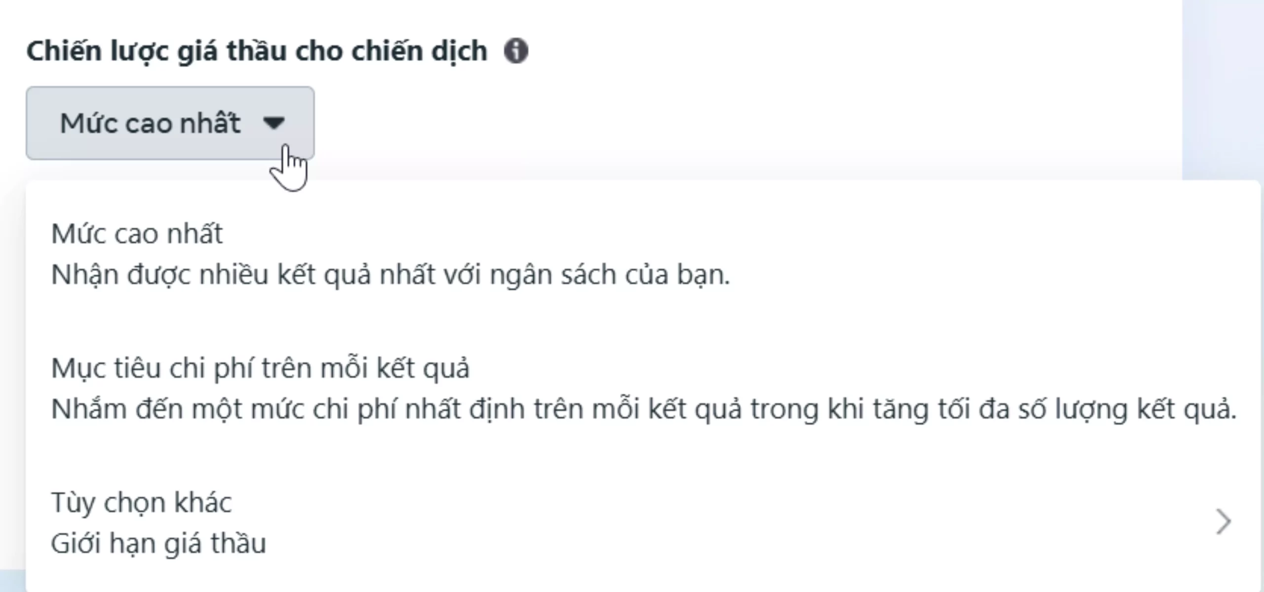 Đấu thầu tự động và đấu thầu thủ công: Facebook cung cấp hai hình thức đấu thầu: đấu thầu tự động và đấu thầu thủ công. Đấu thầu tự động giúp Facebook tự điều chỉnh giá thầu sao cho phù hợp để tối ưu hóa kết quả, trong khi đấu thầu thủ công cho phép bạn kiểm soát giá thầu và giới hạn chi phí cho mỗi hành động cụ thể.