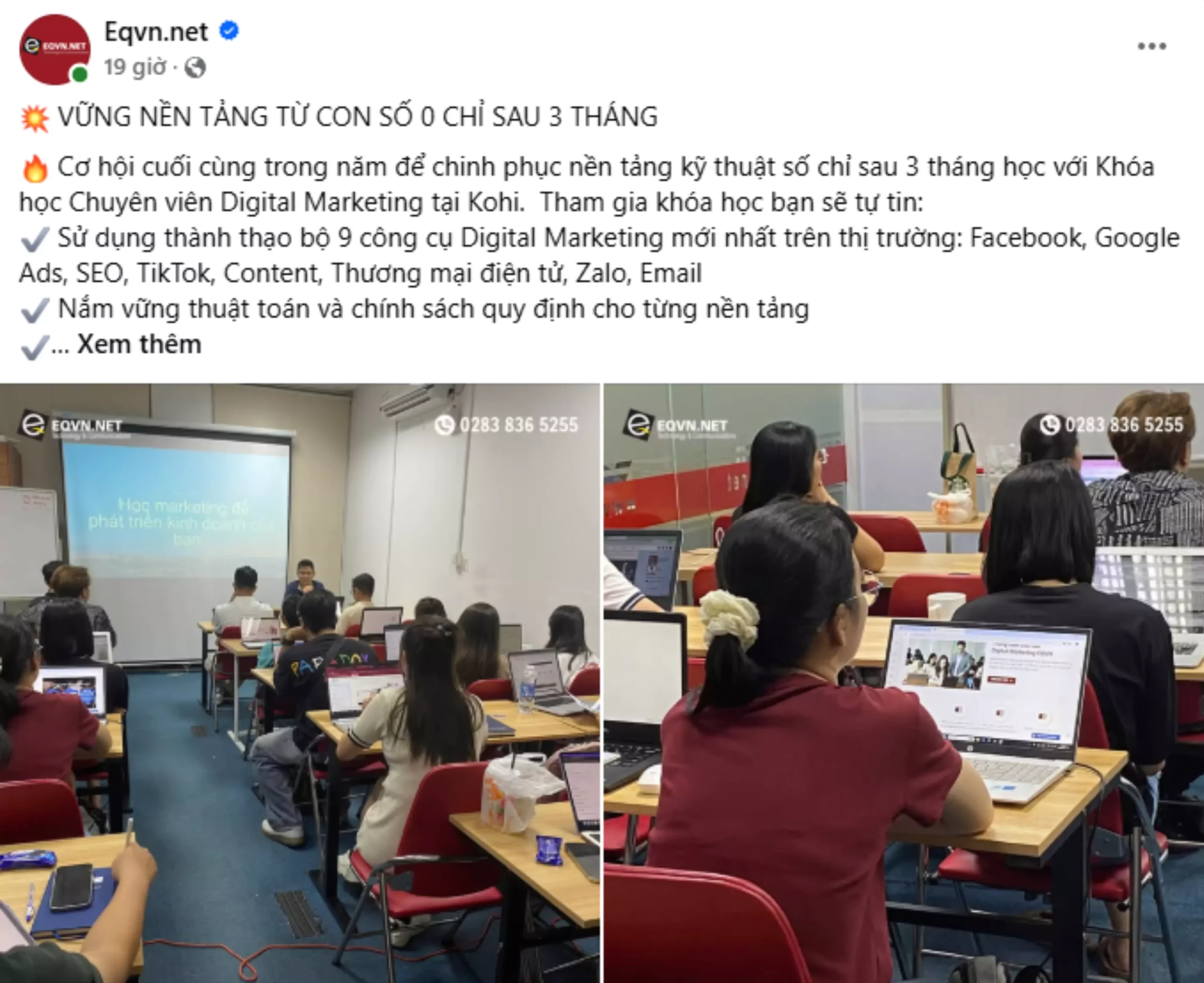 EQVN là đơn vị tiên phong trong lĩnh vực đào tạo khóa học Digital Marketing từ năm 2009 và là đối tác chính thức của Facebook và Google. Với kinh nghiệm hơn 20 năm, chúng tôi sẽ cung cấp cho bạn những kiến thức Digital Marketing mới nhất và hữu ích nhất! Tìm hiểu thêm về EQVN tại đây nhé!