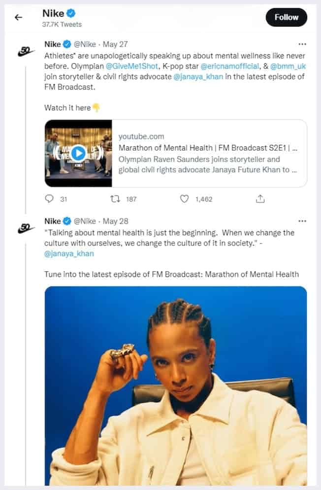 Thương hiệu cũng sử dụng các phương tiện truyền thông để nâng cao mức độ nhận thức thương hiệu, thu hút khách hàng, thúc đẩy các sáng kiến xã hội để củng cố cộng đồng. Chẳng hạn, ví dụ bên dưới cho thấy loạt bài đăng trên Twitter của Nike, nhằm quảng bá Tuần lễ Nhận thức về Sức khỏe Tâm thần giữa các vận động viên.