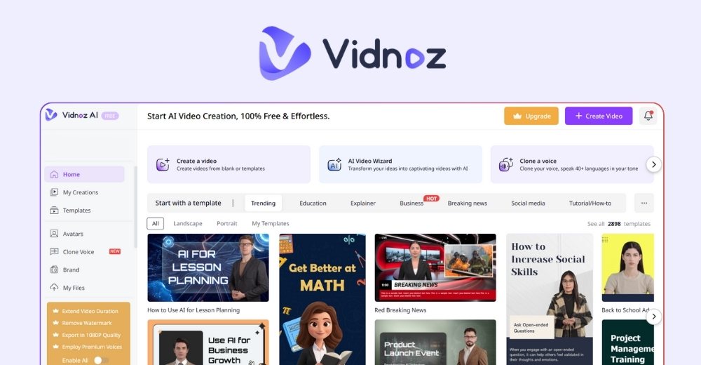 Vidnoz AI là công cụ tạo video AI miễn phí với thư viện avatar, voice và template đồ sộ.