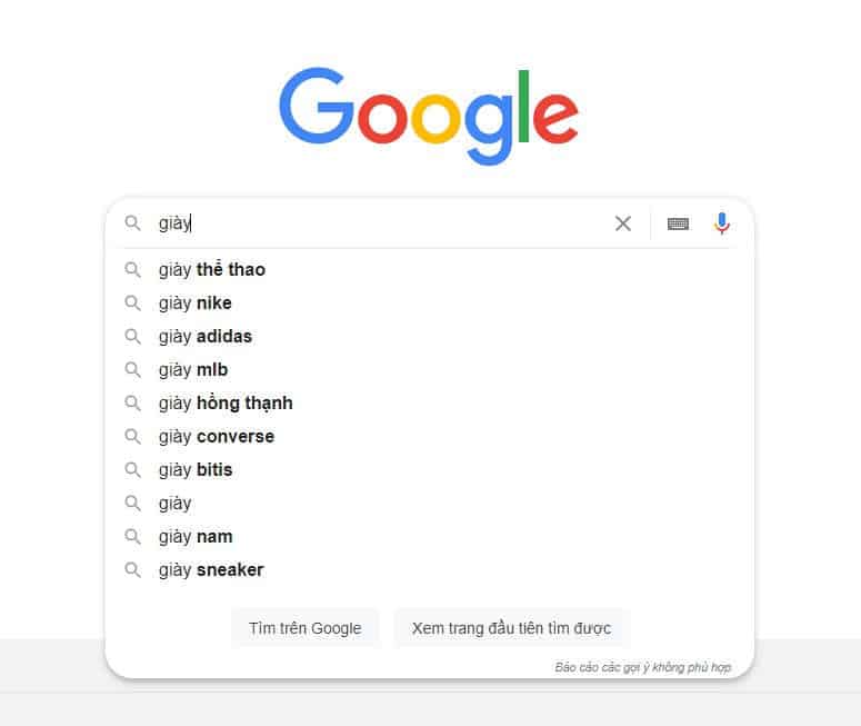 Tất cả những gì bạn phải làm là bắt đầu nhập một từ liên quan đến doanh nghiệp của bạn – chẳng hạn như “giày” và các tìm kiếm mà Google gợi ý chính là từ khóa mà bạn nên quan tâm đến.