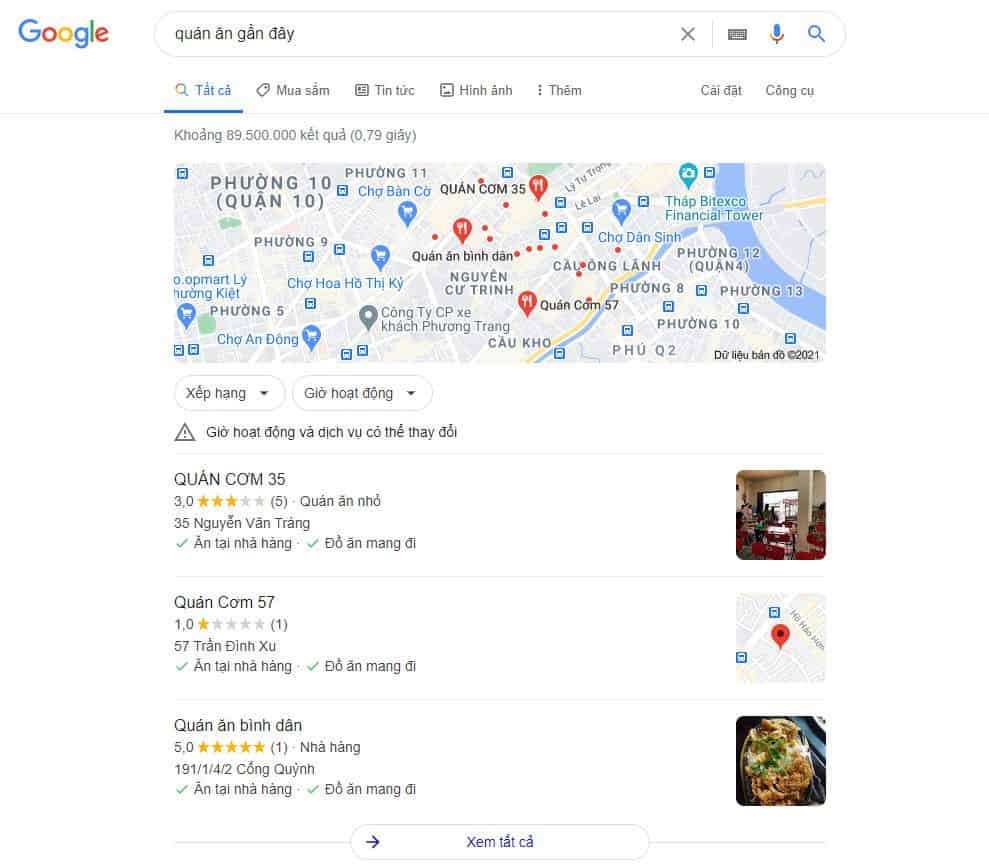Ví dụ như: bạn có thể truy cập Google và tìm “Quán ăn gần đây”, kết quả sẽ hiển thị những nơi gần nhất bạn có thể đi đến dựa trên vị trí hiện tại.