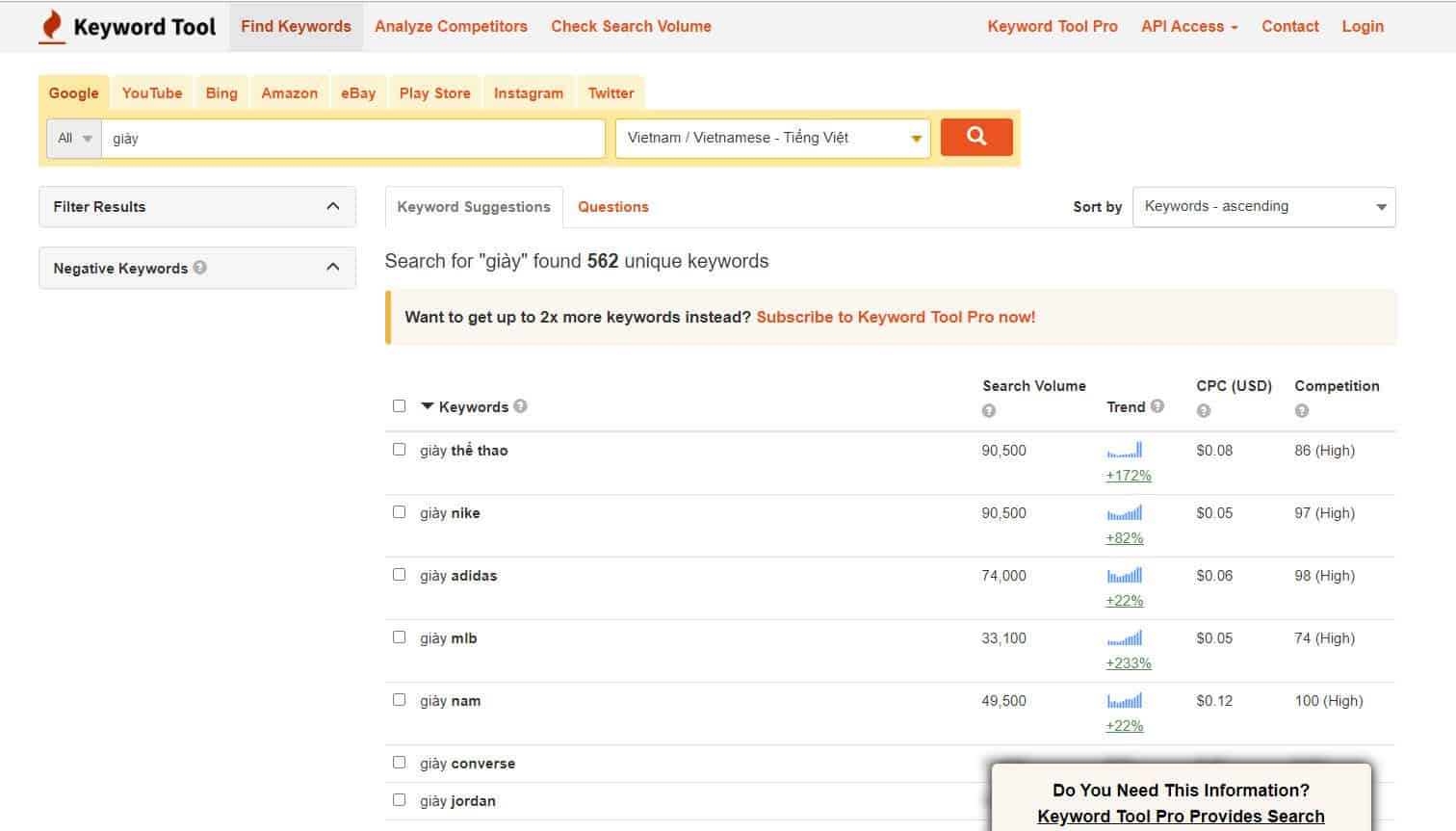 Tất cả những gì bạn phải làm là nhập từ khóa gốc của bạn – một lần nữa, một cái gì đó như “giày” nếu bạn bán giày chạy bộ và Keywordtool.io sẽ tạo danh sách các từ khóa có thể có để bạn nhắm mục tiêu.