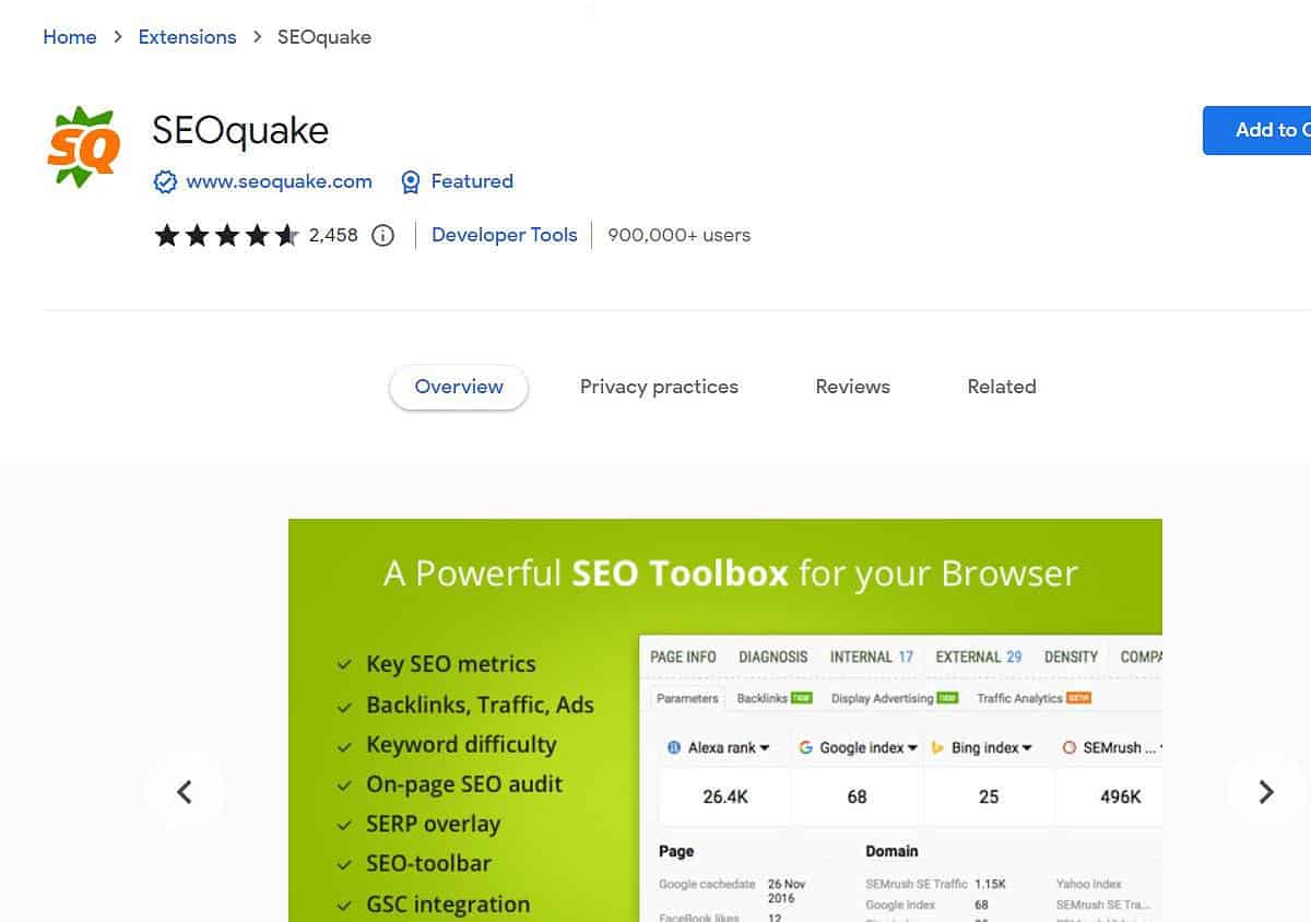 SEOQuake là một công cụ SEO miễn phí, tập trung hỗ trợ các yếu tố SEO Onpage trên website. Một điểm cộng lớn cho công cụ này là có thể thêm vào tiện ích của Chrome, Firefox,… được xem là tiện ích mở rộng để dễ dàng sử dụng và kích hoạt. Bên cạnh tính năng tối ưu SEO On-page, SEO Audit, công cụ SEOQuake còn giúp phân tích mật độ từ khóa (keyword density), so sánh độ uy tín và chất lượng của tên miền (domain) và URL.