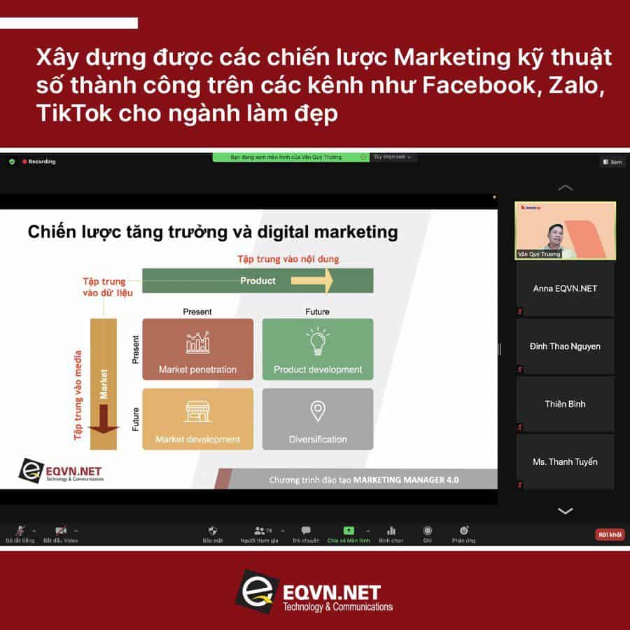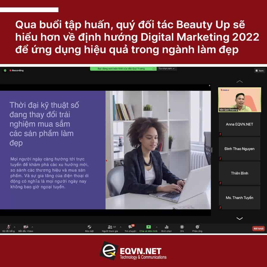Hiểu được vấn đề này, vào tháng 2 vừa qua EQVN đã tổ chức buổi tập huấn trực tuyến đào tạo cho công ty Beauty Up. Buổi tập huấn có chủ đề “Bứt phá kinh doanh 2022: Từ chiến lược đến thực thi” được tổ chức qua Zoom. Buổi đào tạo tập trung vào việc làm thế nào để thu hút khách hàng trong thời đại kỹ thuật số, cách xây dựng chiến lược cũng như các hoạt động kinh doanh phù hợp cho công ty Beauty Up.