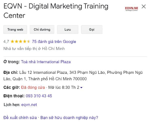 EQVN là đơn vị tiên phong trong lĩnh vực đào tạo khóa học Digital Marketing từ năm 2009 và là đối tác chính thức của Facebook và Google. Với kinh nghiệm hơn 20 năm, chúng tôi sẽ cung cấp cho bạn những kiến thức Digital Marketing mới nhất và hữu ích nhất! Tìm hiểu thêm về EQVN tại đây nhé!