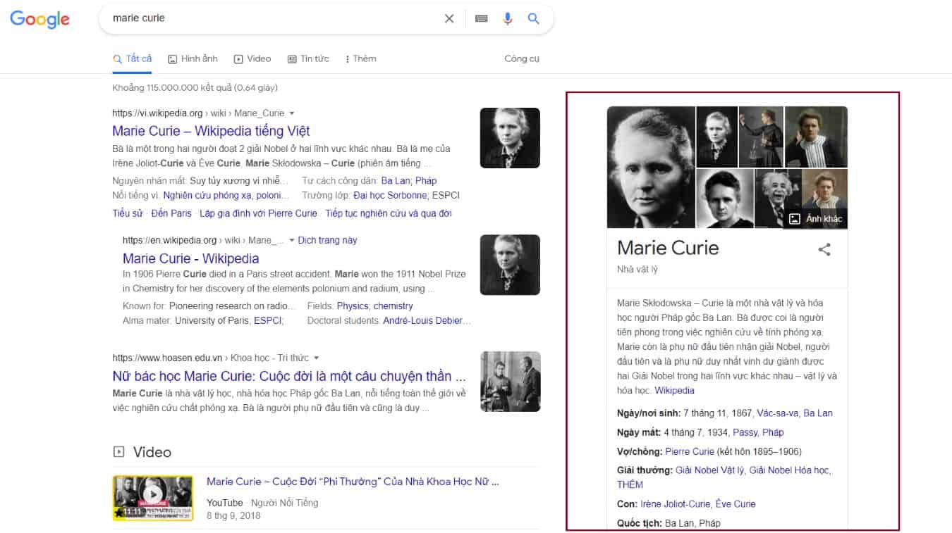 Sau khi đã thu thập đầy đủ thông tin về các yếu tố trên, Google sẽ tiến hành xếp hạng kết quả tìm kiếm ngay khi người dùng truy vấn thông tin về một thực thể nào đó. Ví dụ như khi người dùng tìm kiếm thông tin về thực thể “marie curie”, Google sẽ đưa ra SERPs như sau: