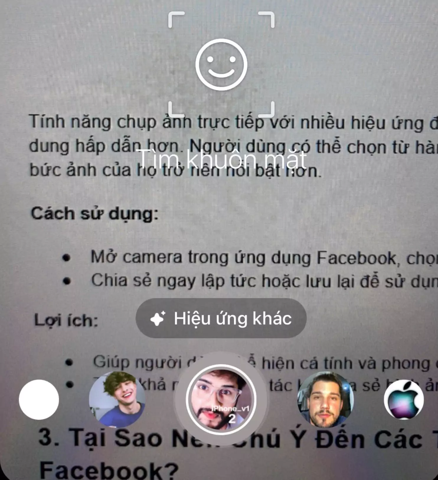 - Mở camera trong ứng dụng Facebook, chọn hiệu ứng mong muốn và chụp ảnh.