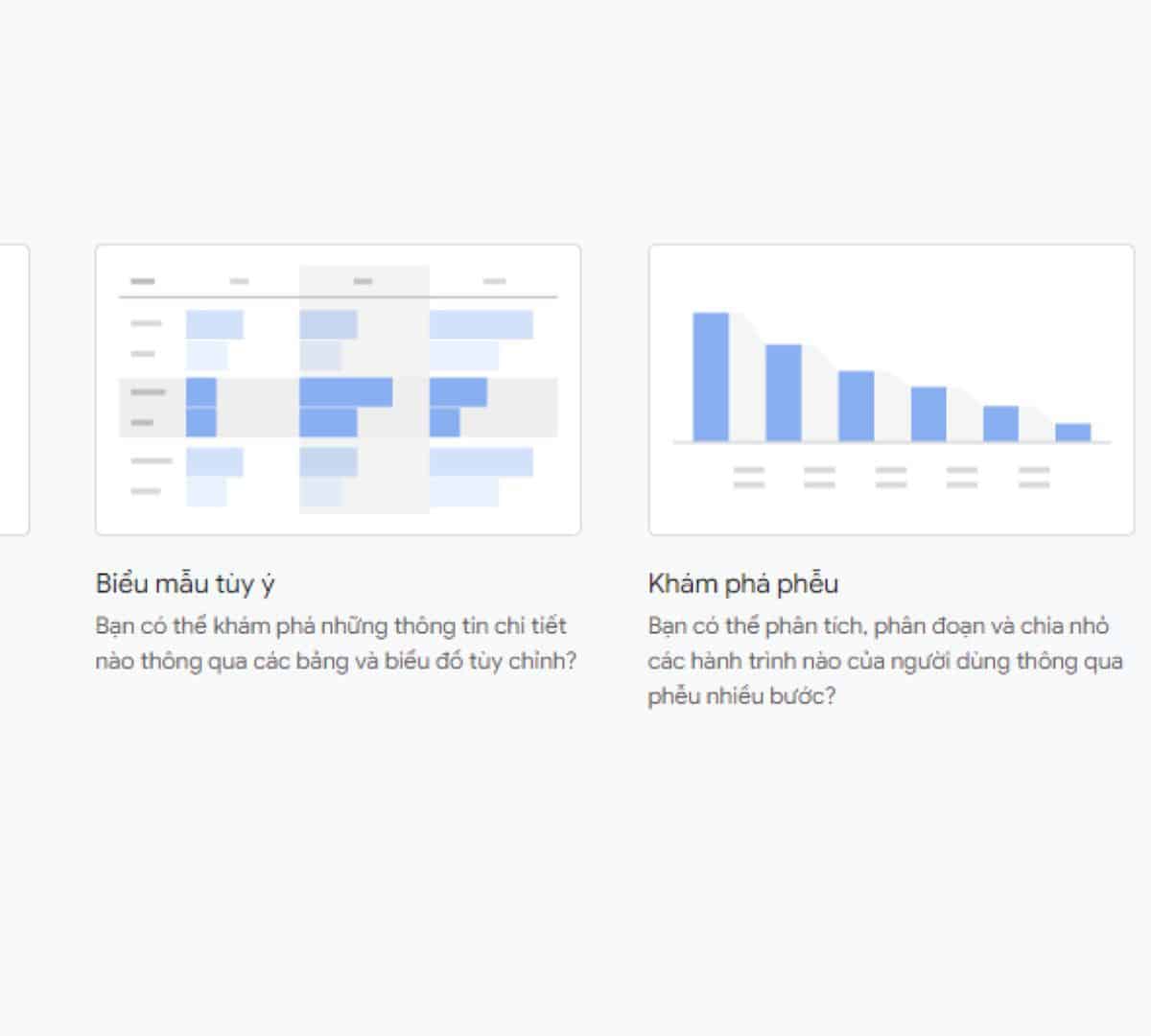 Với Exploration Reports, bạn sẽ nhận được một mẫu dựng sẵn cho nhiều phân tích khác nhau hoặc có thể tùy chỉnh báo cáo theo ý muốn. Ngoài ra, Exploration Reports cung cấp đa dạng lựa chọn để thêm các phân đoạn, thứ nguyên, và chỉ số khác nhau vào báo cáo tùy chỉnh của bạn.