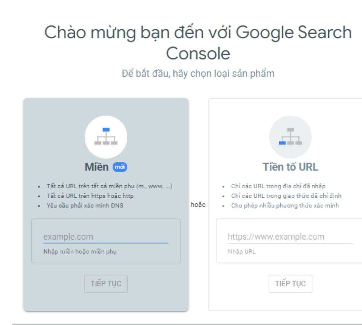 Sau khi đăng nhập xong, ta có thể thêm loại thuộc tính thông qua domain hoặc URL (URL prefix). Tiếp theo, nhập root-domain của trang rồi nhấn Continue.