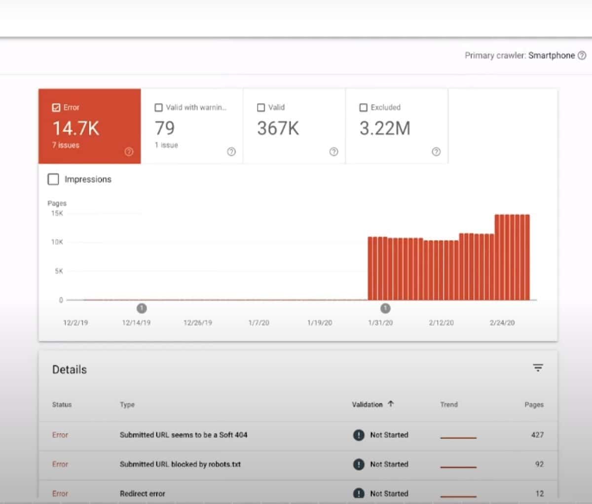 Trong Google Search Console, Tab Index Coverage (phạm vi lập chỉ mục) rất hữu ích cho việc biết số lượng trang nằm trong index của Google (kể từ lần cập nhật gần nhất) và cảnh báo các lỗi khiến Google không thể lập chỉ mục trang một cách chính xác.