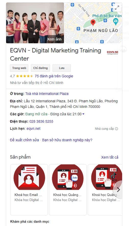 EQVN là đơn vị tiên phong trong lĩnh vực đào tạo khóa học Digital Marketing từ năm 2009 và là đối tác chính thức của Facebook và Google. Với kinh nghiệm hơn 20 năm, chúng tôi sẽ cung cấp cho bạn những kiến thức Digital Marketing mới nhất và hữu ích nhất! Tìm hiểu thêm về EQVN tại đây nhé!