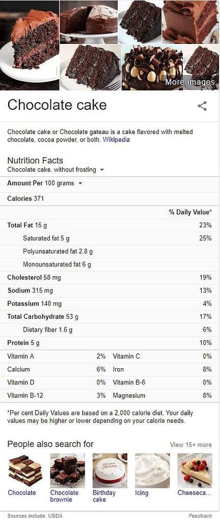 Sơ đồ tri thức còn có một tính năng đặc biệt, đó là cung cấp các thông tin dinh dưỡng về loại thực phẩm, lượng calo hàng ngày,… Bên cạnh đó, những liên kết đến công thức nấu ăn cũng được đề cập, nếu người xem đang có nhu cầu tạo kế hoạch cho bữa ăn hoặc tìm kiếm công thức, các thông tin này sẽ cực kỳ thu hút ý định tìm kiếm của người dùng.