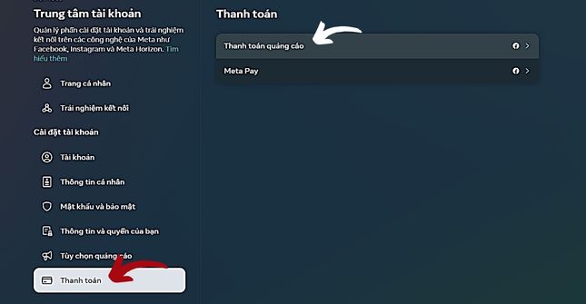 Sau đó, bạn sẽ thấy hai mục thanh toán bao gồm “Thanh toán quảng cáo” và “Meta Pay”. Để add thẻ vào tài khoản quảng cáo, bạn chọn vào mục Thanh toán quảng cáo.