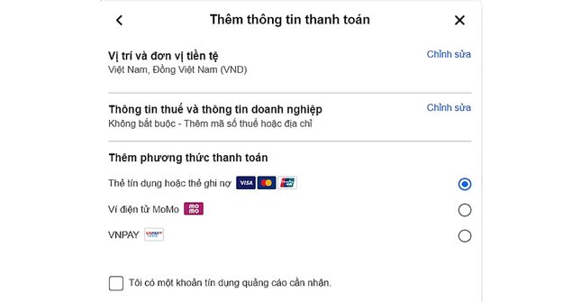 Meta đã cung cấp cho bạn 3 phương thức thanh toán: Thẻ tín dụng hoặc thẻ ghi nợ, Ví điện tử MoMo, VNPAY.