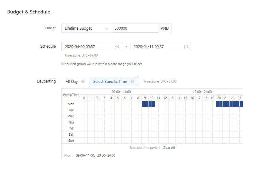 Dayparting: Tính năng này cho phép bạn chọn thời điểm cụ thể để hiển thị quảng cáo trong ngày.