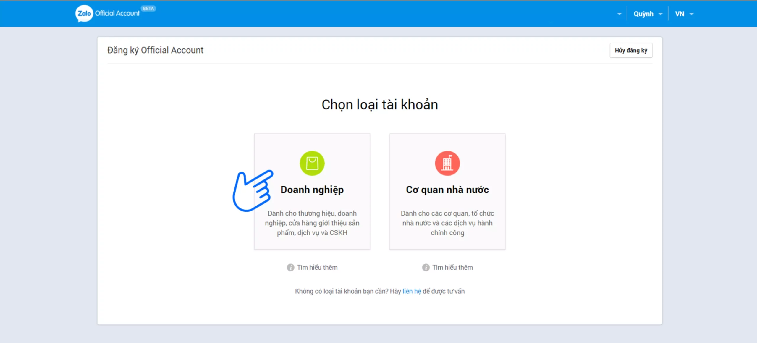Khi đăng nhập thành công, bạn sẽ được yêu cầu chọn loại tài khoản Zalo OA mà bạn muốn tạo. Chọn Tài khoản doanh nghiệp: Dành cho các doanh nghiệp muốn xây dựng thương hiệu và tiếp thị sản phẩm, dịch vụ.