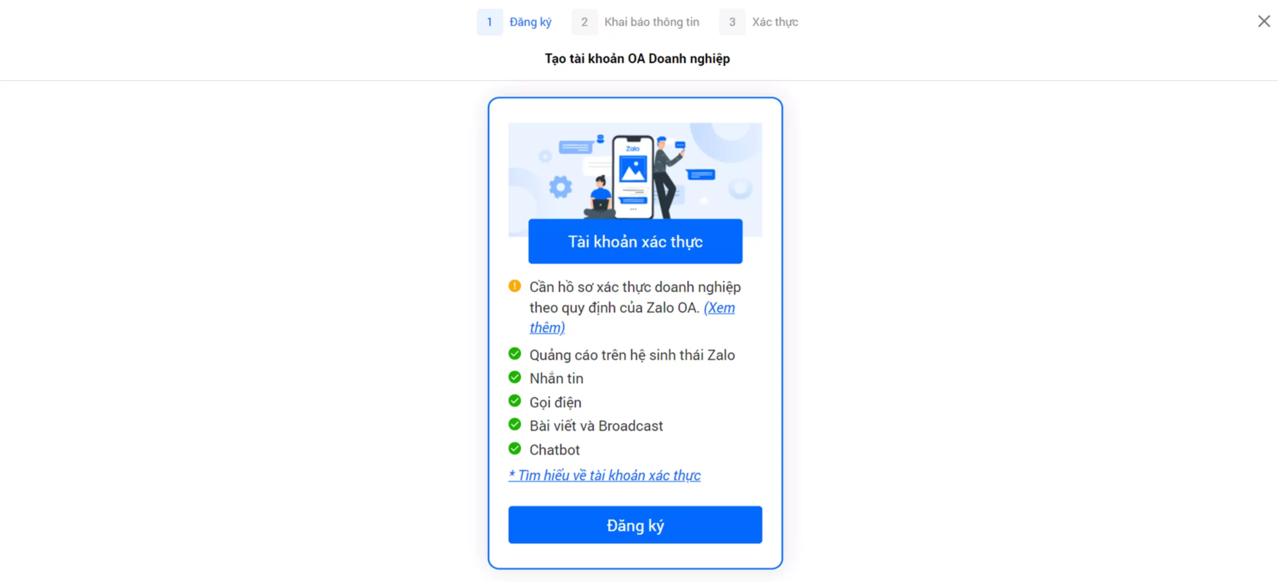 Sau khi tạo thành công tài khoản OA xác thực, vui lòng thực hiện xác thực trong vòng 14 ngày để hoàn thành quá trình đăng ký. OA xác thực được sử dụng tối ưu các tính năng của OA Doanh nghiệp