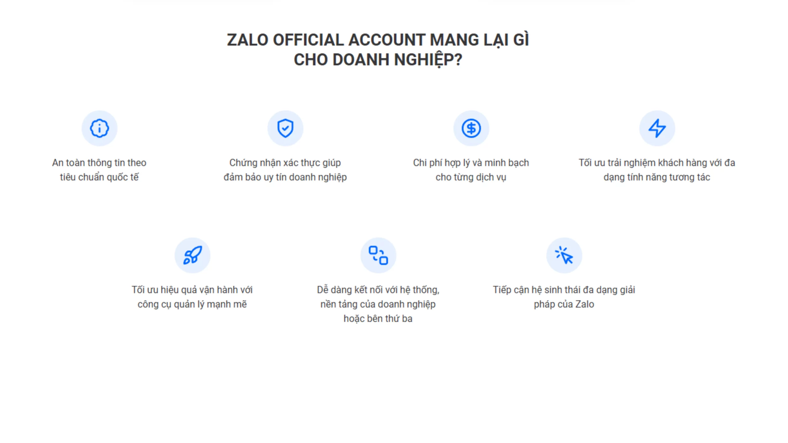 - Tiếp cận hệ sinh thái đa dạng giải pháp của Zalo: Sử dụng Zalo OA, doanh nghiệp có cơ hội tiếp cận hệ sinh thái đa dạng giải pháp của Zalo, từ quảng cáo Zalo đến thanh toán điện tử, giúp nâng cao hiệu quả hoạt động kinh doanh và mở rộng thị trường.