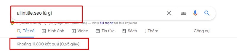 Cách tìm allintitle đơn giản nhất là nhập vào thanh truy vấn của Google với cú pháp: allintitle:từ khoá.