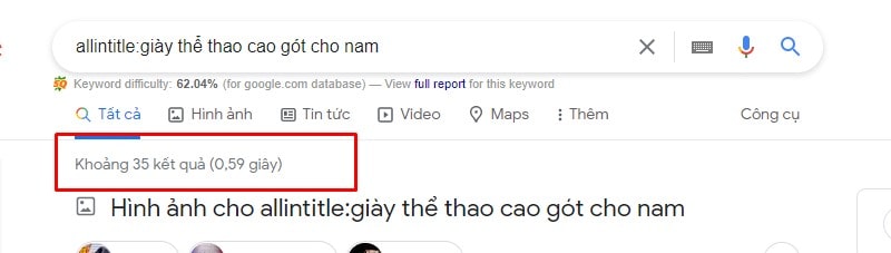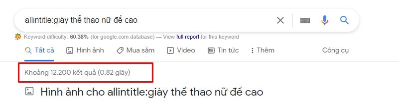 Sau khi thu thập được một danh sách từ khoá, bạn tiến hành kiểm tra allintitle của từng từ khoá. Ví dụ: EQVN sẽ kiểm tra allintitle của từ khoá “giày thể thao nữ đế cao” với lưu lượng tìm kiếm là 200 hàng tháng bằng cú pháp allintitle:giày thể thao nữ đế cao.