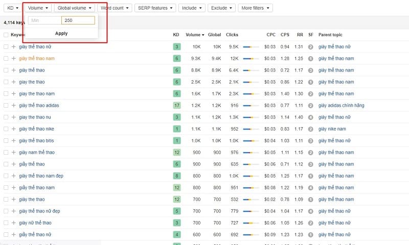 - Lưu lượng tìm kiếm hàng tháng (search volume) < 250