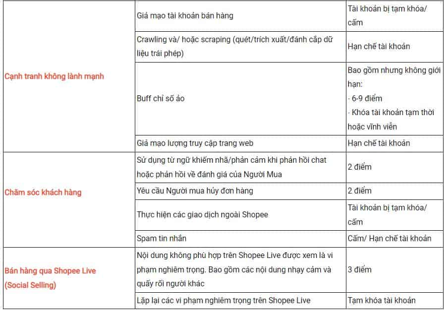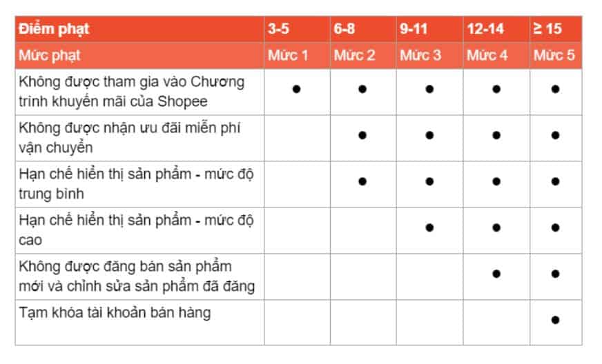 Với mỗi lần vi phạm, số điểm sao quả tạ sẽ được tích lũy dần, cho đến khi đạt đến mức giới hạn thì gian hàng sẽ phải hứng chịu những hình phạt ảnh hưởng đến việc bán hàng trên Shopee như sau: